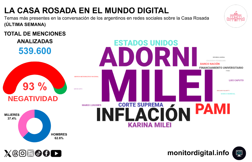 La conversación sobre la Casa Rosada cerró la semana con 539.600 menciones y un 93% de negatividad, un nivel que confirma la persistencia de un clima digital abiertamente adverso para el Gobierno.