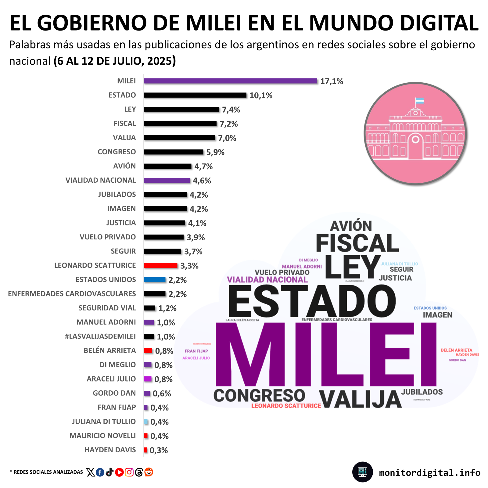 Un segundo eje con fuerte presencia en el diálogo sobre Milei fue el institucional, graficado por términos como "estado" (10,1%), "ley" (7,4%), "congreso" (5,9%), "justicia" (4,1%) y "fiscal" (7,2%).