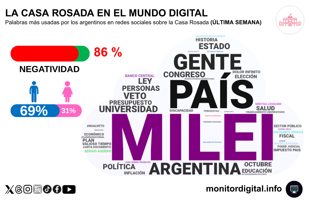 La marca “Milei” vuelve a confirmarse como sinónimo de Casa Rosada en el mundo digital, lo que genera un doble efecto: alto volumen de conversación, pero también alto riesgo de desgaste por personalización extrema de la gestión.