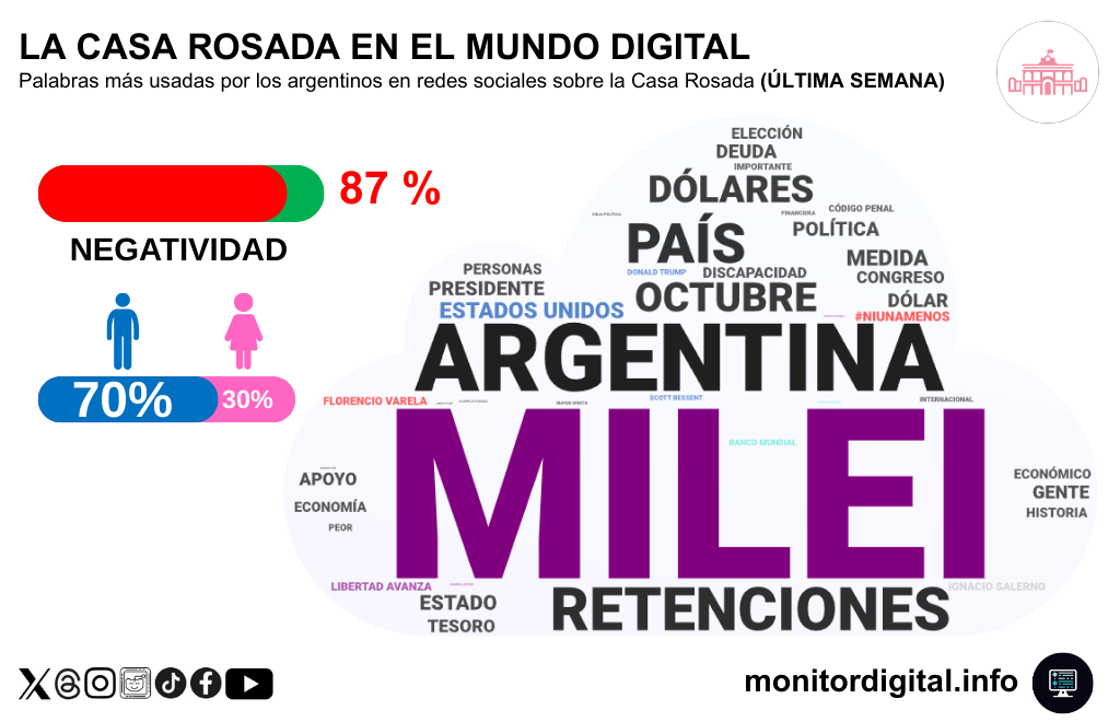 La conversación digital de la semana sobre la Casa Rosada se caracterizó por un altísimo nivel de negatividad (87%), sostenido en todas las plataformas.