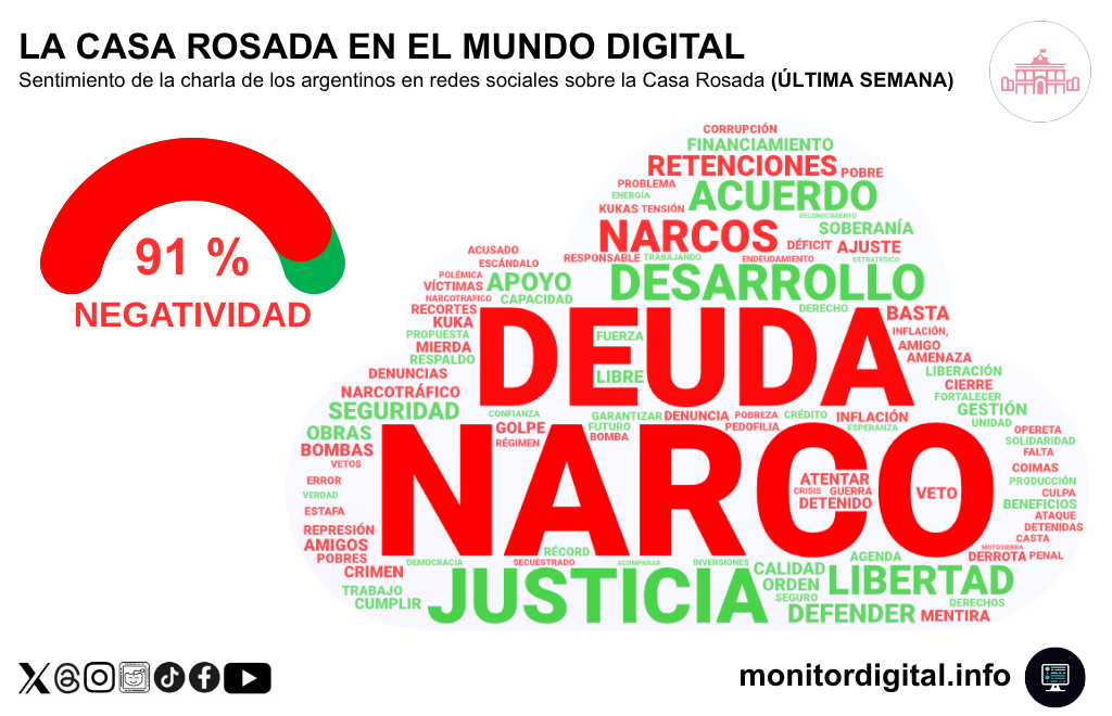- Narco / Narcotráfico: se instala como la principal temática de conversación negativa sobre la Casa Rosada, muestra que la asociación con criminalidad atraviesa la percepción pública (especialmente por el caso Espert).