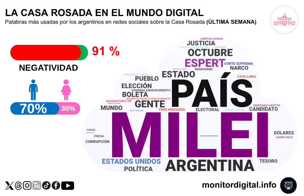 La semana del gobierno en las redes sociales mostró una altísima negatividad hacia la Casa Rosada (91 %), con un predominio masculino del 70 % en la conversación, lo que confirma que el tono crítico sigue motorizado por usuarios varones politizados —el mismo patrón que se observa en los ciclos de crisis del oficialismo libertario.