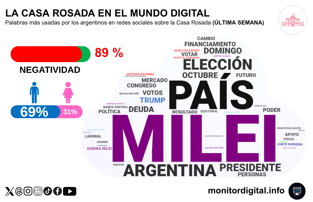 Durante la última semana, el diálogo de los argentinos en redes sociales sobre la Casa Rosada se concentró en un tono abrumadoramente negativo, una constante en nuestro análisis periódico.