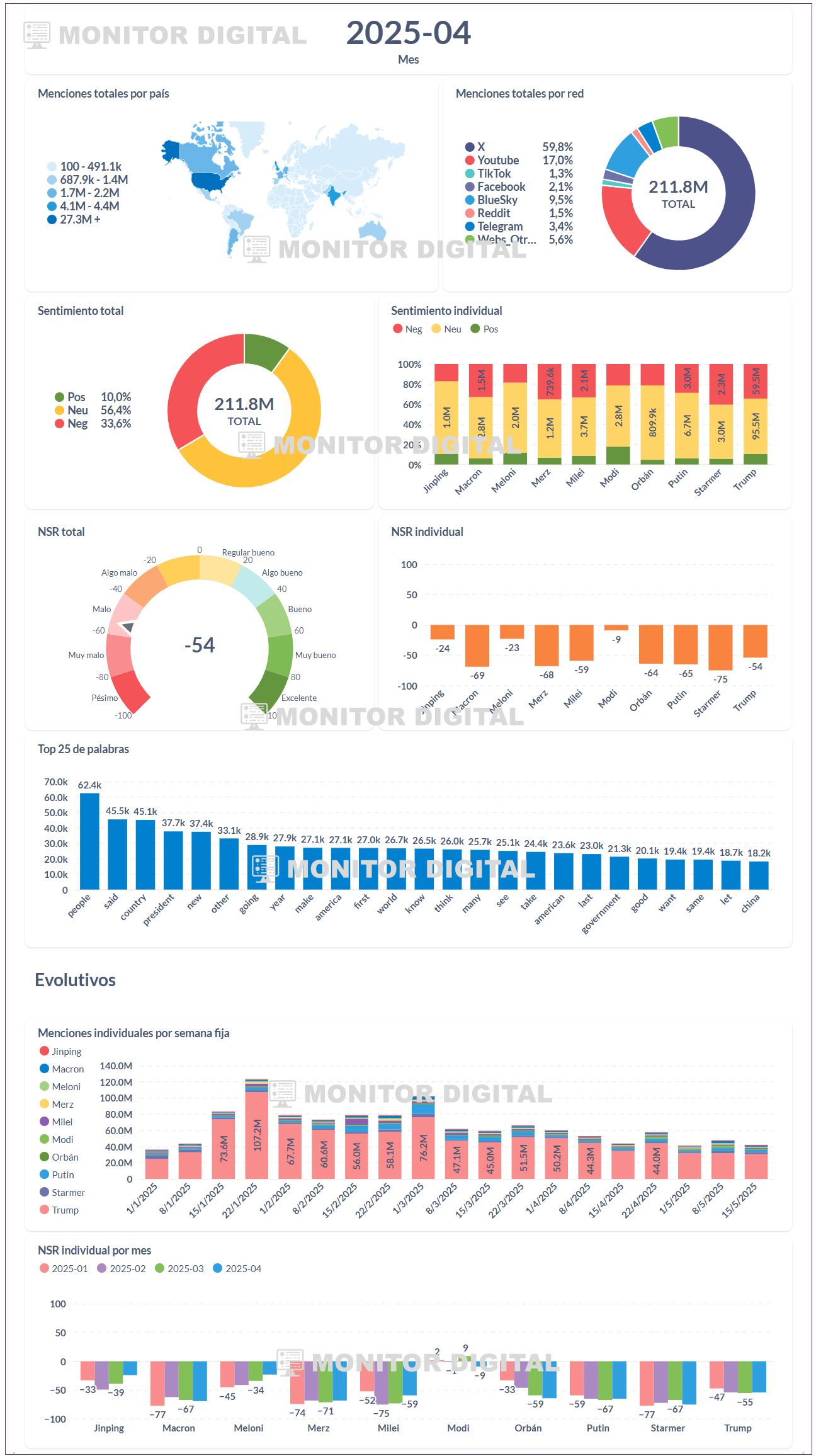 A principios de 2025 comenzamos a medir el sentimiento de la conversación y publicaciones en internet de algunos presidentes y primeros ministros del mundo. Utilizamos la IA para calcular los principales indicadores con la información recolectada, la cual sumarizamos en este widget: