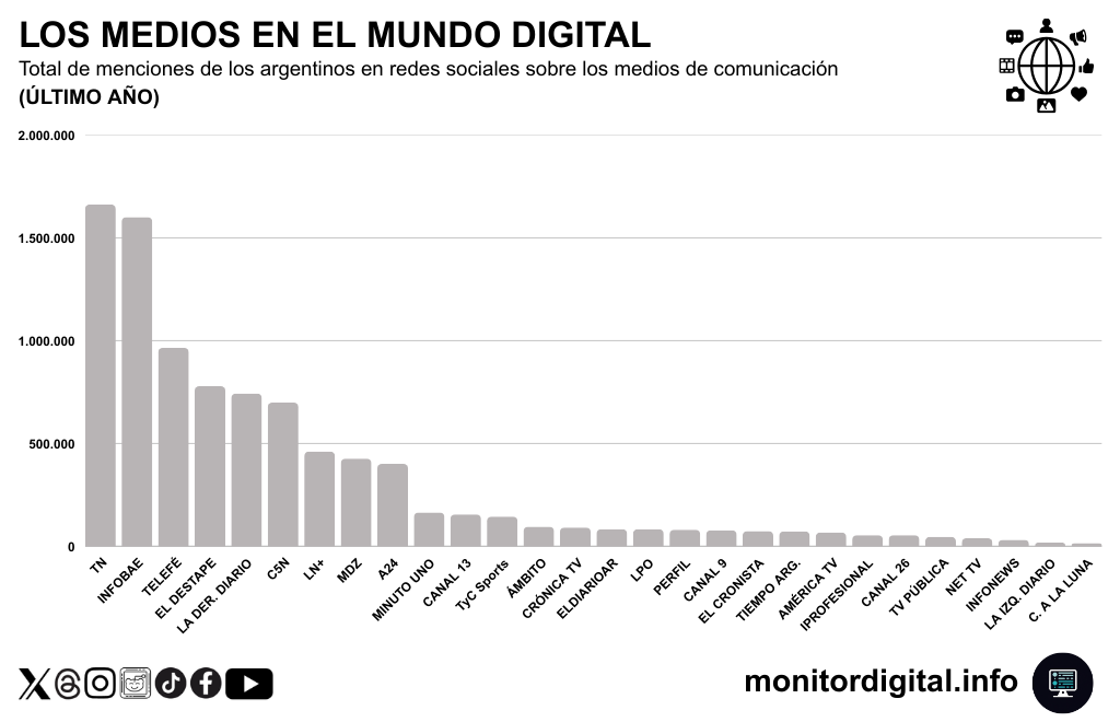 Luego se ubican LN+, MDZ y A24, con menor masa total de menciones en redes, pero con capacidad para pegar saltos en meses de fuerte coyuntura.