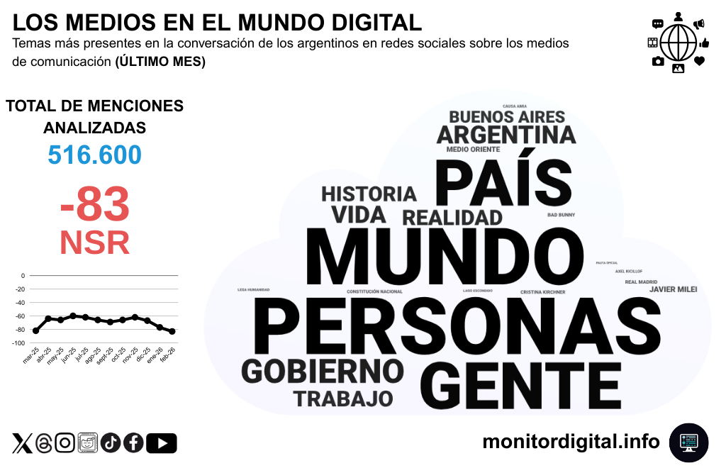 Los medios de comunicación argentinos concentran una conversación masiva en redes, con una centralidad que crece, pero con clima de opinión de alta negatividad.