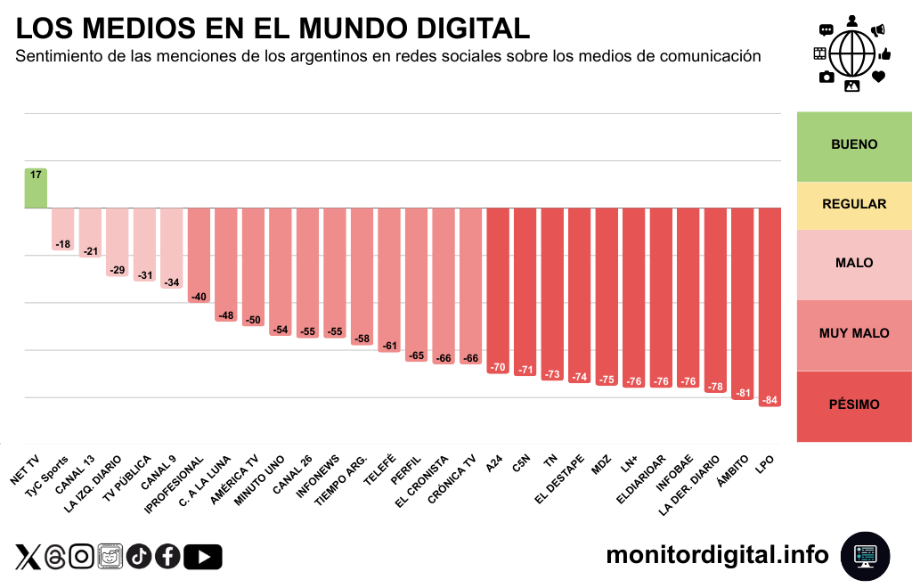 El dato más duro del relevamiento de Monitor Digital sobre los medios de comunicación en las redes sociales está en el sentimiento.