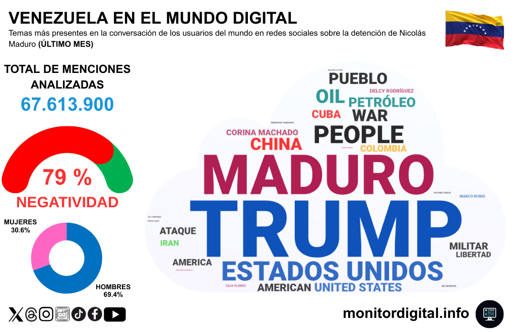 El volumen de menciones de los usuarios del mundo dejó a Donald Trump como gran amplificador, pero el clima digital descargó el veredicto especialmente sobre Nicolás Maduro, con un encuadre narrativo dentro del cual términos como captura, régimen y legitimidad cobraron protagonismo.